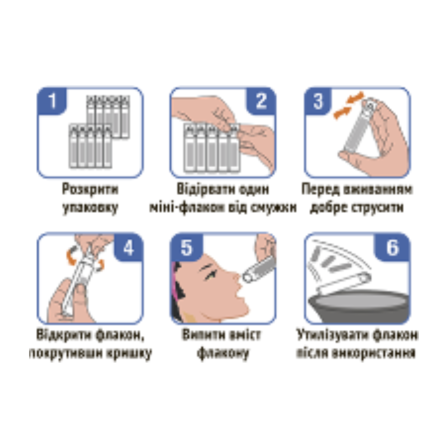 Рекомендації з використання: розкрити упаковку; відірвати один міні-флакон від смужки; добре струсити; відкрити флакон, покрутивши кришку; випити вміст флакону; утилізувати флакон після використання.