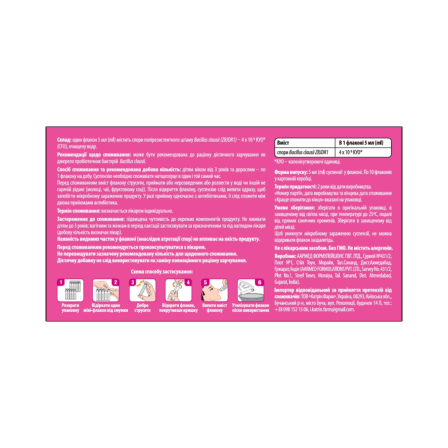 Склад: один флакон 5 мл (ml) містить спори полірезистентного штаму Bacillus clausii (ZBJDR1) - 4 х 109 КУО* (CFU),очищену воду.