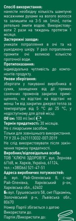 Спосіб використання: нанести необхідну кількість шампуню масажними рухами на вологе волосся та залишити на 3-5 хв. (min), потім ретельно змити водою. Використовувати 2 рази на тиждень протягом 1 місяця.