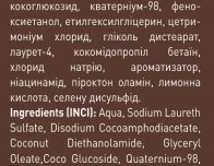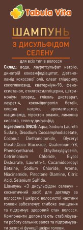 Склад: вода, лауретсульфат натрію, динатрій кокоамфодіацетат, діетаноламід кокосової олії, олеат гліцерилу, кокоглюкозид, кватерніум-98, феноксиетанол, етилгексилгліцерин, цетримоніум хлорид, гліколь дистеарат, лаурет-4, кокомідопропіл бетаїн, хлорид натрію, ароматизатор, ніацинамід, піроктон оламін, лимонна кислота, селену дисульфід.